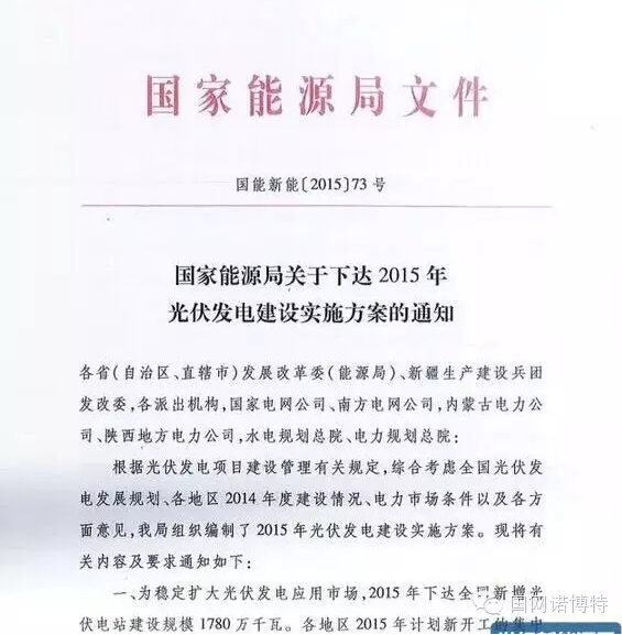 國家能源局關(guān)于下達(dá)2015年光伏發(fā)電建設(shè)實(shí)施方案的通知